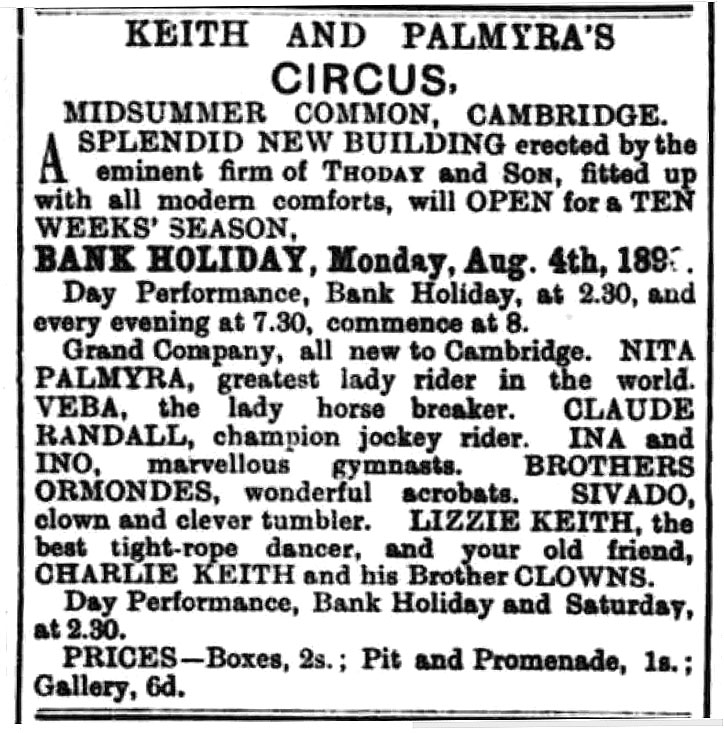 — all Cambridge knows CHARLIE KEITH . . . I have erected a New Building, expressly built for the occasion by Thoday and Son. This is the 59th circus building I have erected—more than any other Circus Proprietor in England. You do not need puff, but pure amusement. I make no boast that my circus is superior to others. I simply open a New Circus Building, will return you worth for your money, and always provide a High-Class entertainment.