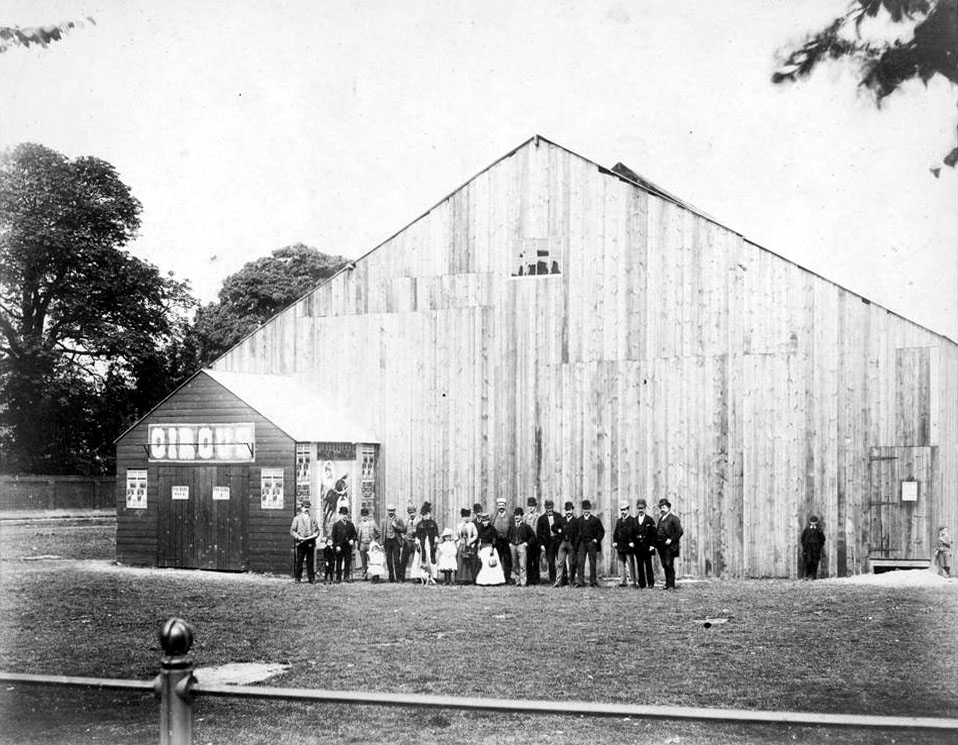 The ‘Splendid New Building erected by the eminent firm of Thoday and Son’. David Fitzroy (1998, page 161) tells us that this picture shows the Keith and Palmyra families in front of the the circus on Butt Green, Midsummer Common in the summer of 1890. The railings are of a design still familiar to us and there is evidence that this is the part of Butt Green west of Victoria Avenue (which was opened in December 1890) and north of Jesus Lane. That plot was enclosed by Jesus College in 1930 in an exchange of land with Cambridge Borough. (Victoria & Albert Museum)