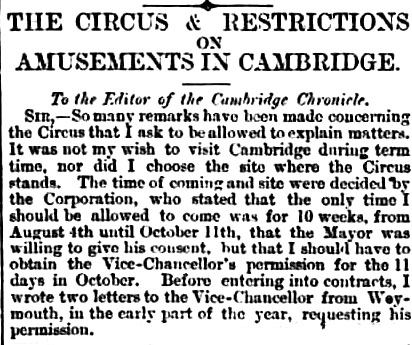 Now the theatre is allowed to open at intervals during the whole term, but the Vice-Chancellor draws the line at the circus. [The University] absolutely refused to allow it to be open on a single day of term, and the season was brought to an unceremonious conclusion on September 30th, to the loss of the artistes and the irritation of the townspeople. This is one of the exceptional privileges of the University which many think ought to be swept away.