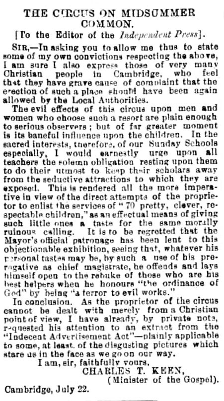 Despite the previous year’s dispute with the Vice-Chancellor, Keith was back on Midsummer Common in a new structure built by Thoday and Son on 5 July 1891 (Cambridge Chronicle and Journal, 3 July 1891, page 8). However, it wasn’t long before a new enemy of popular culture, Baptist minister Charles T Keen, wrote to the Cambridge Independent, (25 July 1891, page 8) with this attack on the circus: