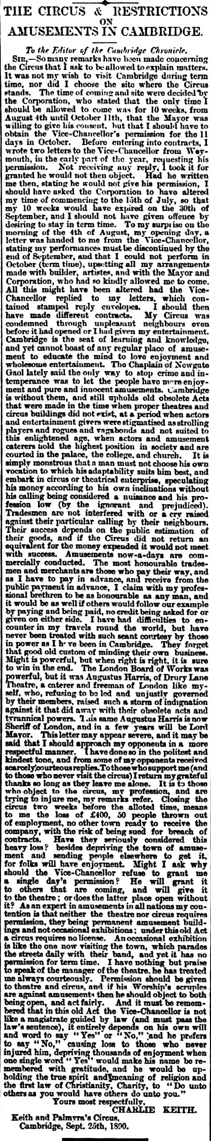 A really brilliant season was brought to a close on Tuesday last at the circus. The building has been crowded night after night . . . Mr. Keith has not been at all loath to express his opinion about the action of the Vice-Chancellor and certain members of the Town Council, owing to which he has been compelled to curtail his season. He again referred to the subject . . . when he thanked his audience for their patronage, and promised an early return visit.