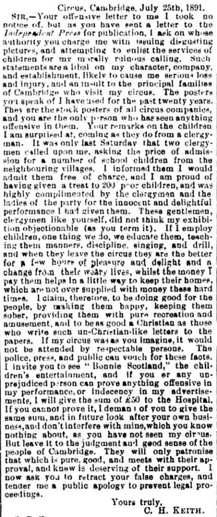 Despite the previous year’s dispute with the Vice-Chancellor, Keith was back on Midsummer Common in a new structure built by Thoday and Son on 5 July 1891 (Cambridge Chronicle and Journal, 3 July 1891, page 8). However, it wasn’t long before a new enemy of popular culture, Baptist minister Charles T Keen, wrote to the Cambridge Independent, (25 July 1891, page 8) with this attack on the circus: