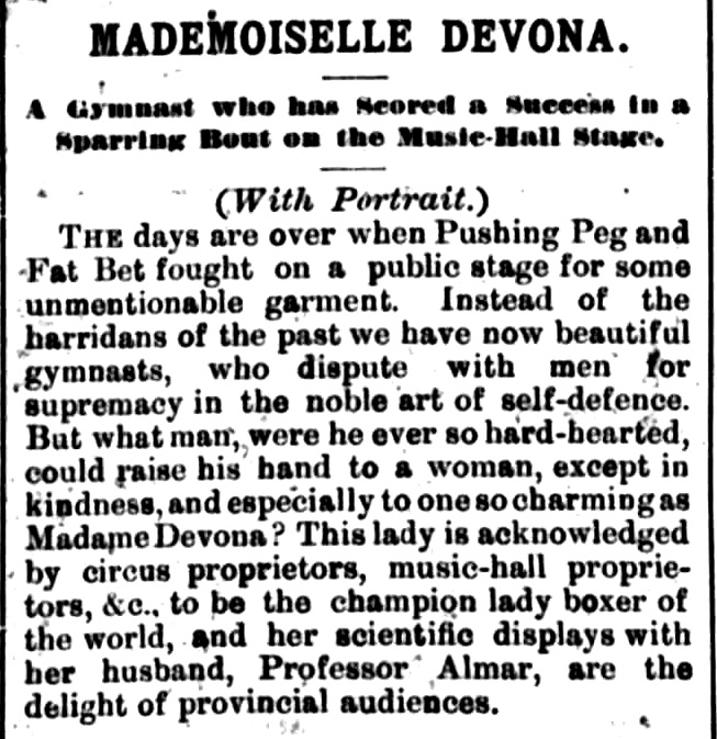 Another change of programme brought singer, dancer and comedienne Pansy Forrist, and also on the bill her mother the singer Maud Danvil. More bizarre turns were contortionist Gorge Rowe, the Silver Eel, from the Hippodrome, Paris, ‘gliding about in serpent-like fashion’ (CDN, 10 August 1897, p 3), who managed to sit upon his head several times, and Mademoiselle Devona and her husband Professor Almar, who fenced, single-sticked and boxed together, the professor completing the event by boxing with a game-cock. The Professor continued his martial act but by 1905 had changed to working with performing dogs.