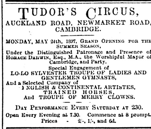 The second season at the New Circus opened on Tuesday 25 May in the presence of Mayor Horace Darwin who arrived a little late. (He was probably dealing with important council business or running the Cambridge Scientific Instrument Company, which he had founded in 1881.) He was nevertheless greeted by the band playing God Save the Queen and the assembled audience standing, interrupting the equestrian skills of Mademoiselle Caroline.