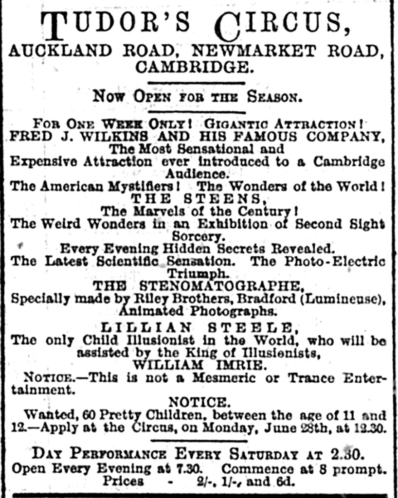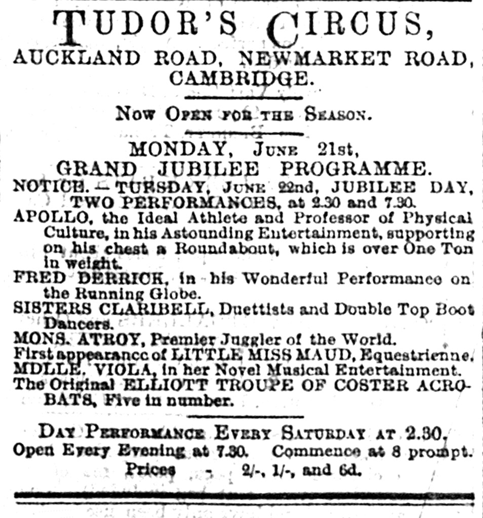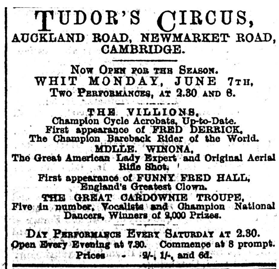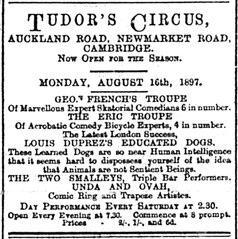 It had been a warm and sunny August in Cambridge and if those, including the CDN reviewer, ‘who have not fled to the seaside to revive their drooping spirits are wondering how to relieve the monotony of the already ominously lengthening evenings, Mr Tudor should experience little difficulty in attracting large audiences to his circus’ (CDN, 24 August 1897, p 3).