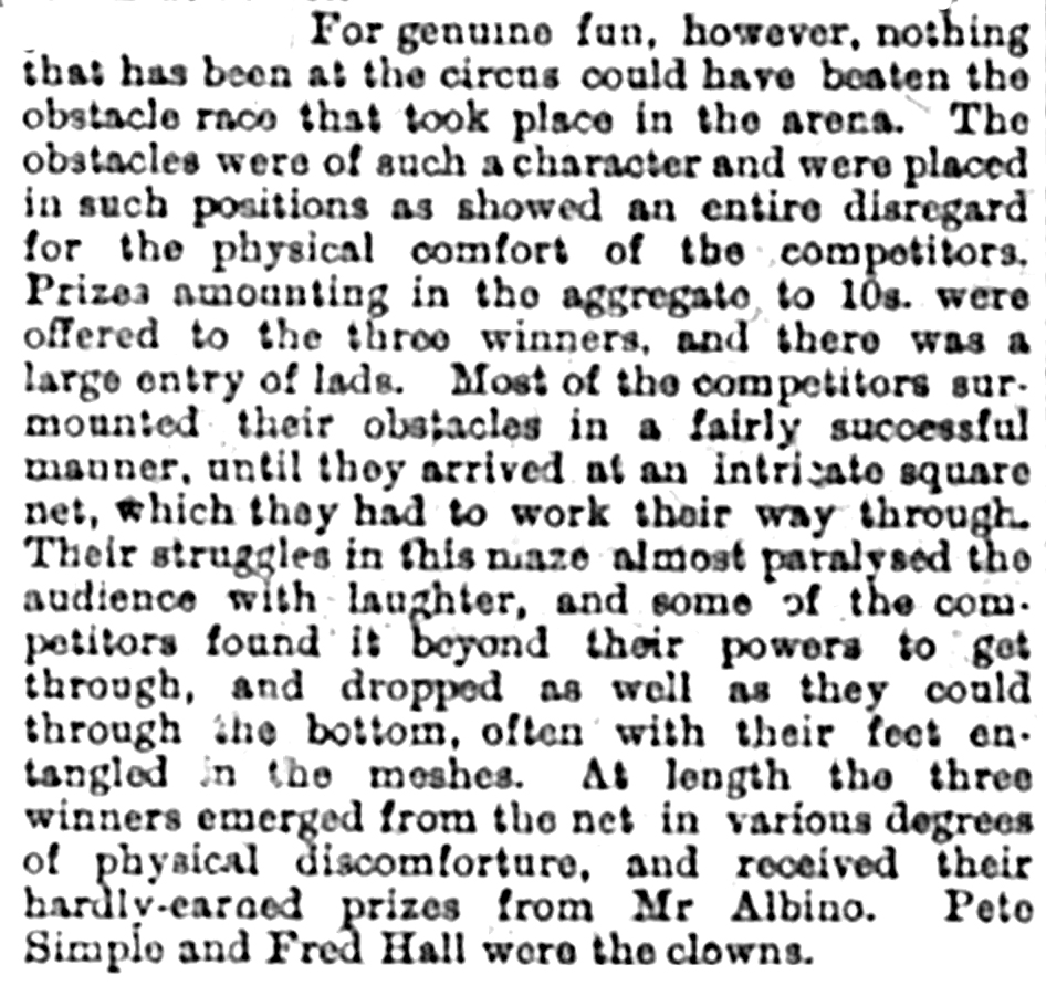 On 2 August the ‘popular little circus’ was packed and the CDN reviewer, arriving a little late, had to stand. In readiness for the holiday season the programme was completely changed, with singers, contortionists, performers on trapeze and on tight-rope, club-swinging and clog dancing, nearly all new to Cambridge. The audience much appreciated Mr Raymond, the champion one-legged dancer who performed very cleverly both with and without a crutch but it was the finale of the public obstacle race (prize 10 shillings between the three winners) that was to cause the audience the most amusement