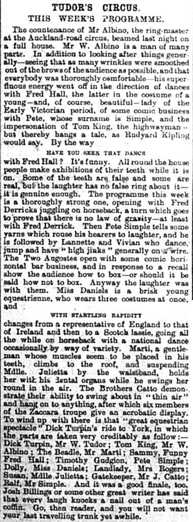 The popular little circus in Auckland Road has lost none of its wonted attractiveness, nor has Mr Tudor lost that happy knack, so necessary to all caterers for the public amusement, of never allowing his performances to drag from start to finish, or his audiences to suffer one twinge of ennui from the time they have taken their seats round his circus ring until their departure.