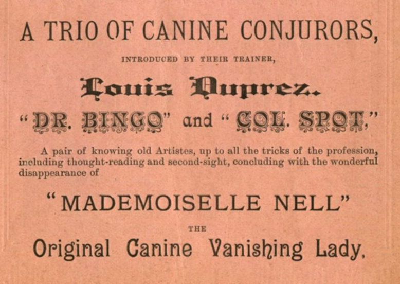 These dogs, he says, are not trained; they are educated, and can read, write, tell the time of day, and play cards. All this they did and more on Monday night, and ‘Colonel’ easily won his round at nap with a gentleman ‘outsider’. The dogs even dabble in second sight, and numbers picked out by members of the audience are soon named by ‘Colonel,’ who appears to be the head of the intelligent family.