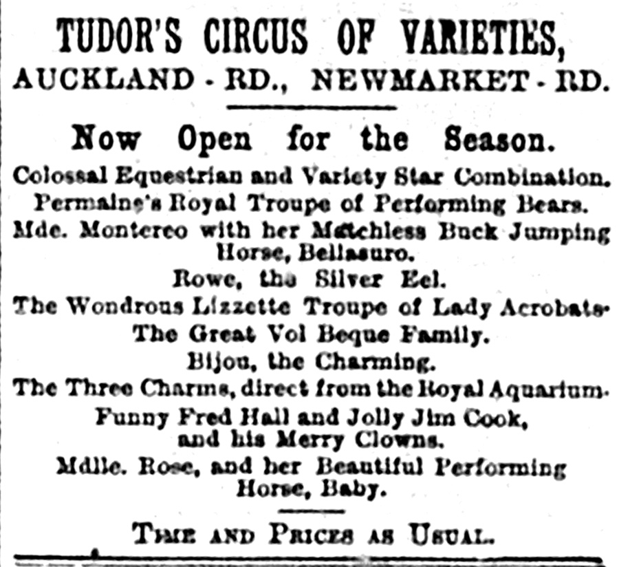 The final CDN review says ‘Seldom have we enjoyed Tudor’s Circus as much as last night. The programme was full of good things and the circus building a perfect storehouse of laughter’ (CDN, 20 September 1898, p 2). The Cambridge Express on 24 September, the final day, announces a night of sports and reports that Mr Tudor will shortly re-open his Auckland Road place of amusement as a music hall. The application for the music and dancing licence earlier points to this development. But never fear, there was one more year of the circus in the Auckland Road building yet to come (CE, 24 September 1898, p 8).