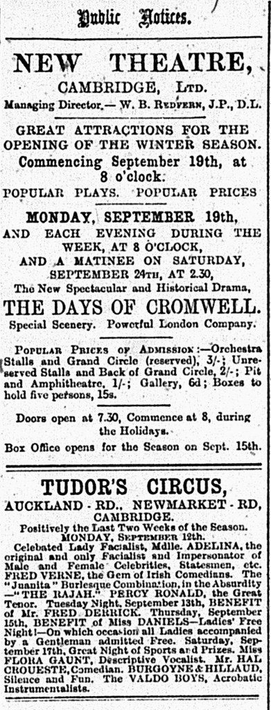 So the competition from Barnum & Bailey had passed, but looming on the horizon was the New Theatre’s winter season, though a play about Oliver Cromwell may not have appealed to the regular circus audience. The next week’s programme included Mdlle Adelina, impersonator of celebrities and politicians of both sexes, Hal Croueste, actor, singer and comedian, who often appeared on the same bill as Flora Gaunt, burlesque singer and actress. For variety there was Fred Verne, the Irish comedian, acrobats The Andys and the Valdo knockabout instrumentalists. There was a benefit night for those two hard-working horse-riders Fred Derrick and Becky Daniels. Another equestrian, Billy the horse-riding goat, showed Mr Tudor’s skills as a trainer according to the Cambridge Express. As the following week our old friend Peter the Riding Goat was advertised, and performed ‘right stoically’ (CDN, 20 September 1898, p 2), we can assume Billy was in fact Peter, unless Tudor had two horse-riding goats!
