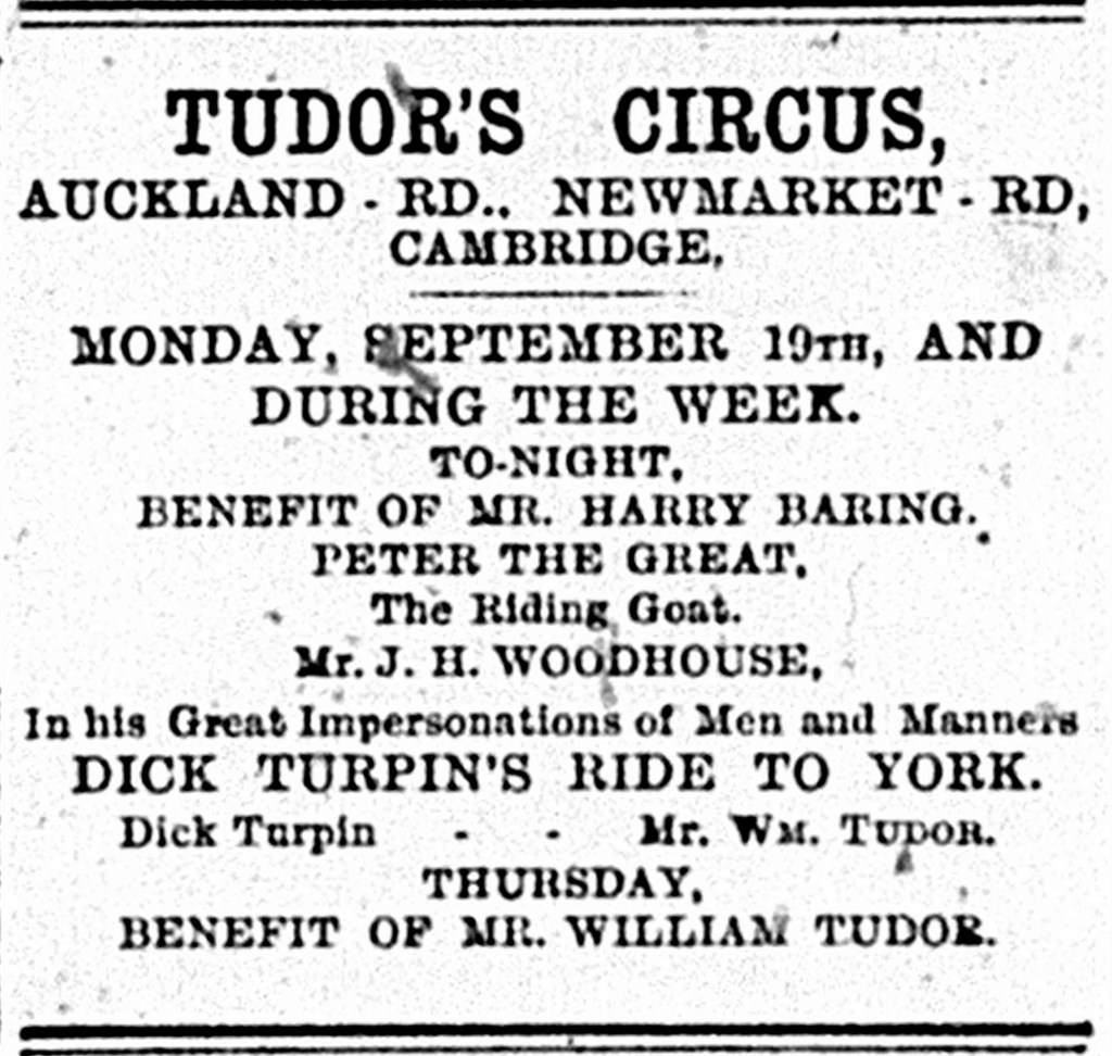 But despite his successes in Cambridge, Tudor may have realised that the tide was turning against circuses in favour of the music hall. On the 29 August he applied to the City ‘through Mr. A. J. Lyon for a music and dancing licence for premises known as Tudor’s Circus, Auckland Road. Mr Lyon said the applicant was well known, and recently the circus had been patronised by the Corporation’ (CIP, 29 August 1898, p 6).