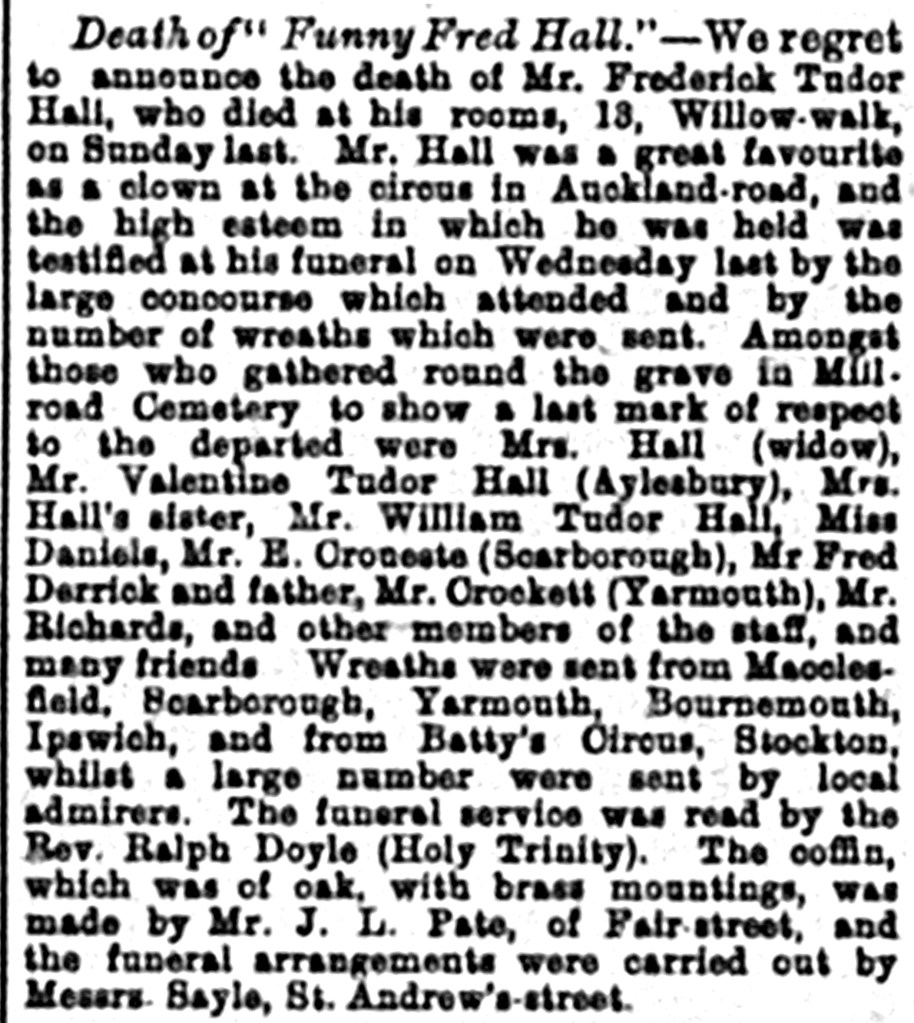 A death notice and thanks from his widow appeared in the trade magazine The Era. For more on this popular character, whose grave is in Mill Road Cemetery, see Frederick Tudor Hall.
