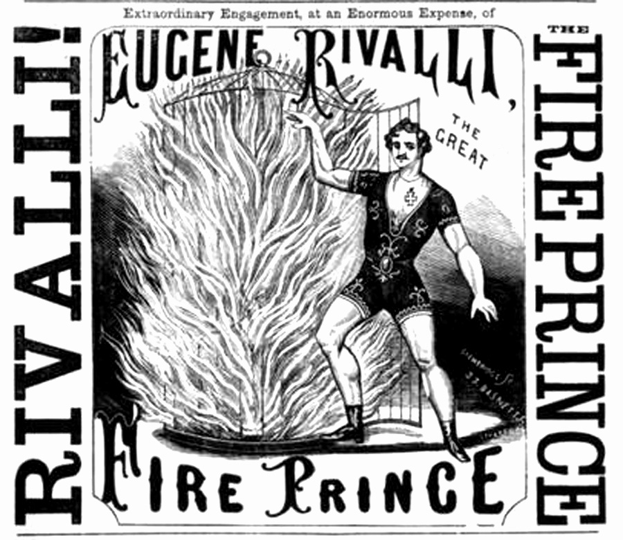Rivalli, or The Brazilian Fire Prince, was born John Watkins in 1853. An orphan, he was apprenticed to a licensed victualler, but an interest in chemistry and in fire led to his later career as the Human Salamander, and he was to tour most of the cities of Europe, with the cage of fire his most famous trick. He died in Berlin in 1900.