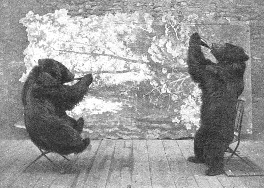 Wiliam Permane, (1864-1939), the equestrian son of a gymnast, stood in for a bear-trainer while travelling with a circus in Russia, and then turned his hand to training bears himself. His bears, usually three female Siberian bears, performed in Sweden and Spain before coming to Covent Garden in London in 1889/90 when ‘people were astounded to see bears standing on their heads, walking a narrow pole, barrel rolling, riding a tricycle and even seated at a table, enjoying a meal. Two of the bears were named Wodki and Sasuski’ (Turner, 1995). The Cambridge audience were amused by the clever if ungainly antics of the three bears who apparently drank beer and rolled logs. For more on Permane’s Bears and animal cruelty see Circus Animals.