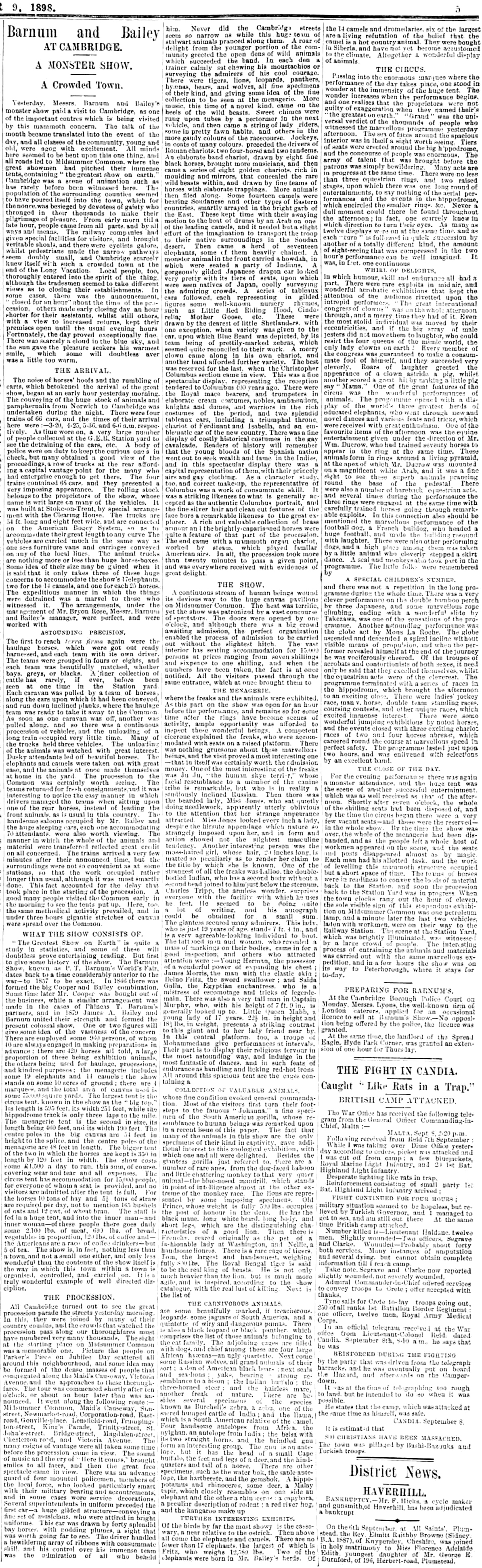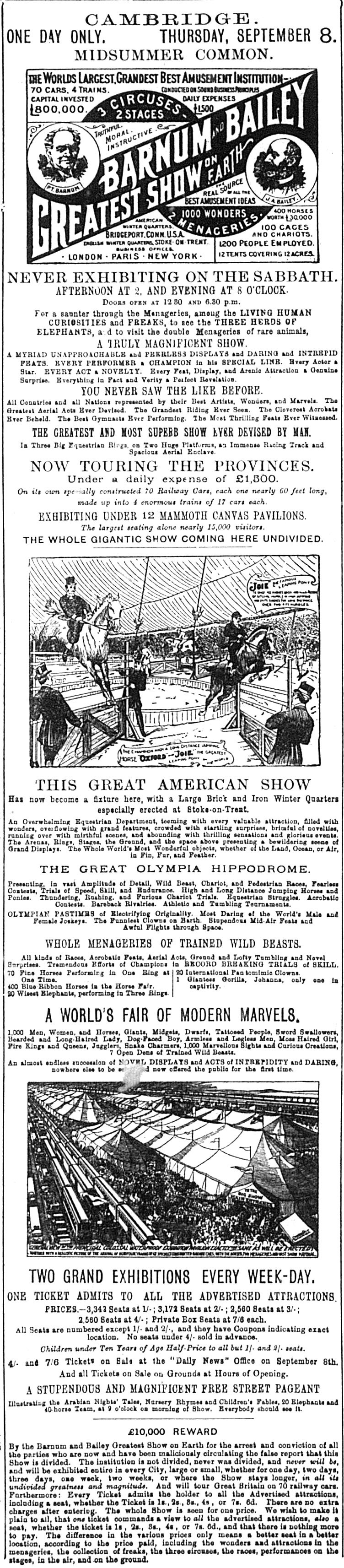 On 27 August a large, illustrated advertisement had appeared for the great travelling circus of Barnum and Bailey.