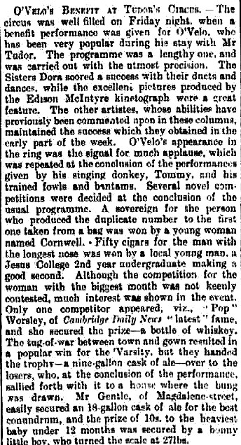 At the end of April Tudor’s circus featured incidentally in a court case. John Henry Bareham, an insurance company agent of 41 Ainsworth Street was charged with attempting to pick the pockets of ladies window shopping in Regent Street. He was seen in a crowd gathered round the spectacle of a motor car in St Andrew’s Street, and another group watching a monkey in a shop window, feeling for purses in the ladies’ back pockets. There was a second charge at Tudor’s Circus on the night of 24 April. Here is the first part of the lengthy account of his trial in the Cambridge Daily News, 29 April 1899, p 3: