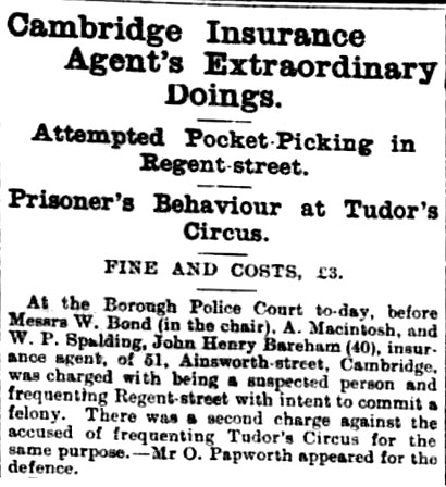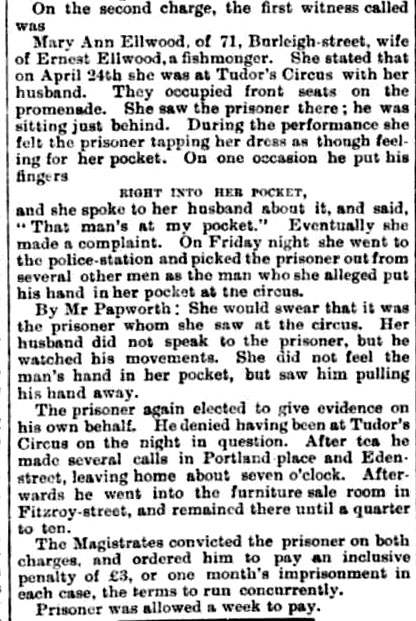 Bareham denied all charges and no purses were found on him. Here is the Cambridge Daily News account of his trial on the second count, at the circus: