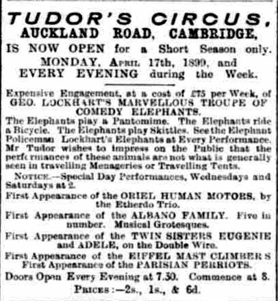 Saturday night was to be the last night and numerous prizes were to be offered to those who visited the end of the season show. Suddenly the season was over, and Tudor’s circus had left Cambridge for good. William went off to Boscombe where, on 17 June, after only three weeks, he closed a planned eight-week season which didn’t draw an audience. In August he was performing at the Grand Circus in Cleethorpes, and then opened his own circus in Darlington in September, which ran until spring 1900.