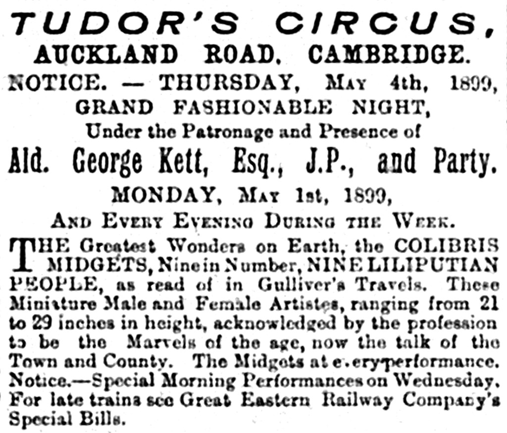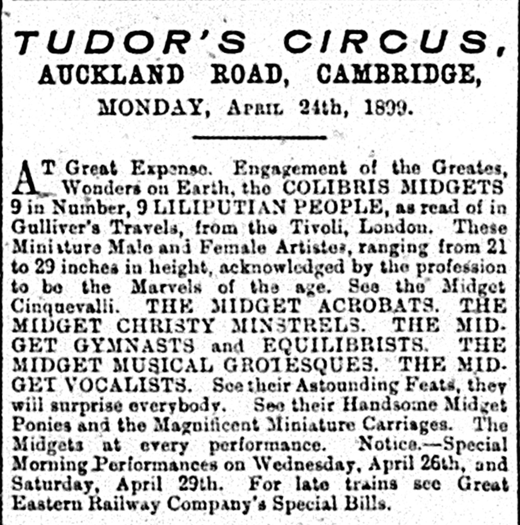 A great attraction is in store for the Cambridge public at Tudor’s Circus, Auckland Road, next week at which the Colibris Midgets have been specially engaged to appear . . . The Lilliputians arrive in Cambridge to-morrow by special first-class saloon, and two wagons containing their wardrobe, luggage, ponies and carriages, by the 4.55 p.m. train. Mrs Moyes, of the Lion Hotel, Petty-cury, has taken the contract to look after these wonderful little people, therefore the suite of rooms is going under extensive alterations to accommodate these small people.