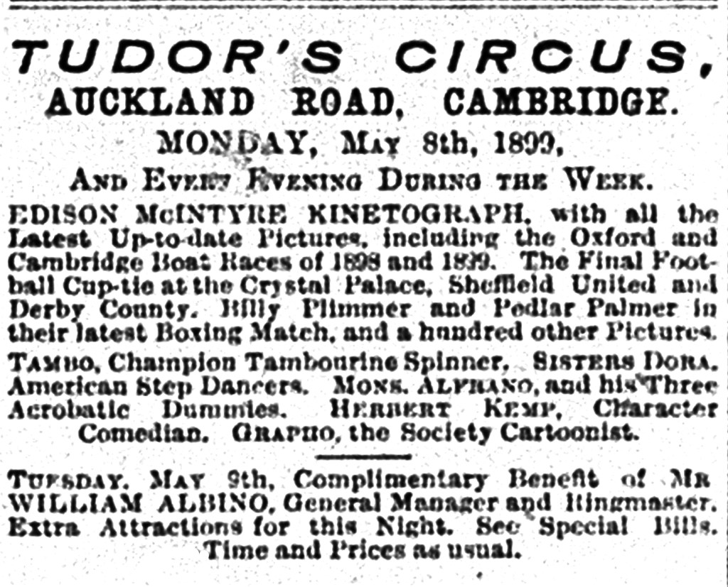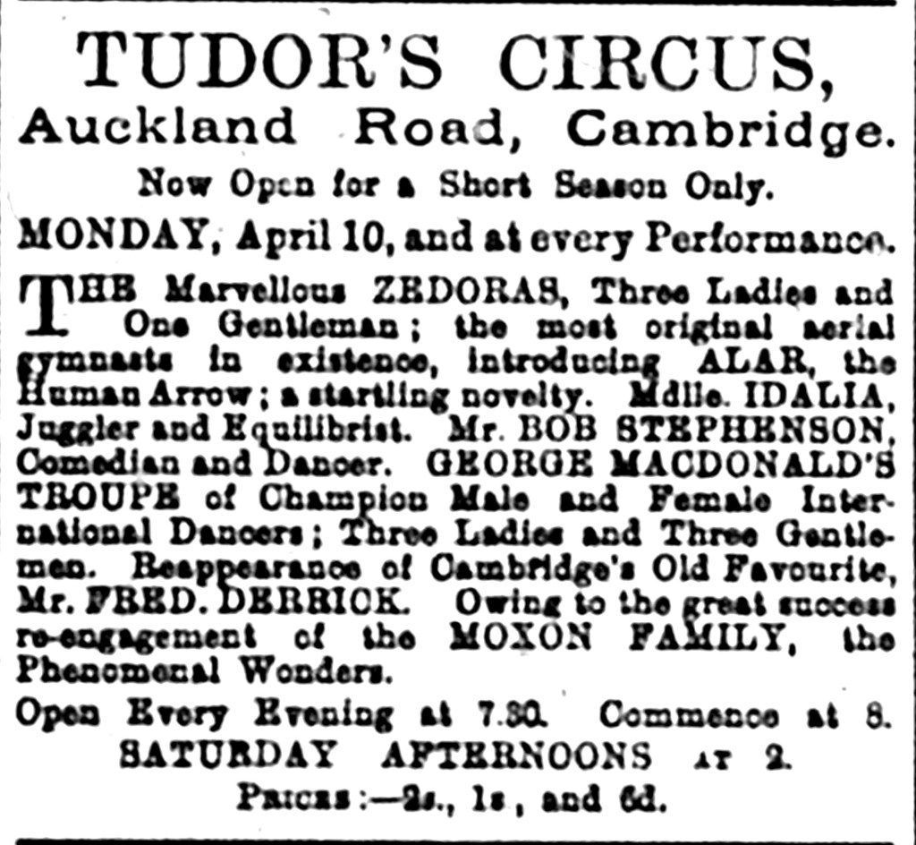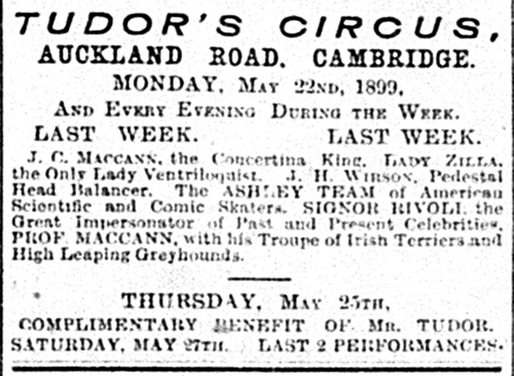 In late March 1899 advertisements began to appear for a new season of Tudor’s Circus. It was a short season and an early start, opening on Easter Monday 3rd April. With much enthusiasm the Cambridge Express said ‘the popular Auckland Road place of amusement rings nightly with the merry jest of the clowns, the crack of the ringmaster’s whip, and the peals of laughter from the crowded audiences’. Mr Albino ‘who has many friends in Cambridge’ was the ringmaster. ‘Mr Tudor’s stay, he said, was limited to eight weeks but during that time he would introduce some of the best talent procurable’ (CE, 8 April 1899, p 8). Tudor’s return was greeted by a packed house and a programme ‘free from vulgarity’ (CDN, 11 April 1899, p 2).