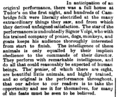 Intriguingly all the reviewers unite in their opinion of the Moxon family, ‘one of the best turns’, a ‘truly wonderful act’, ‘phenomenal wonders of the world’, ‘must be seen to be believed’ who give a ‘a performance that is quite unique in Cambridge’ but do not tell us what it is! But this long-running circus family were known as foot equilibrists, musicians, acrobats and contortionists so presumably it was a combination of these, a more traditional circus act among the music-hall turns.