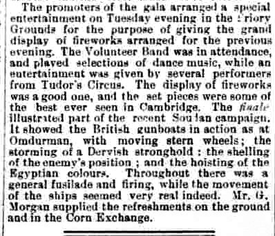 A special fete and gala was held on the bank holiday Whit Monday May 22 in Barnwell Priory grounds in Newmarket Road and several marquees were erected. There would be bands, pipers and dancers and a number of the circus acts would appear, the clowns playing a cricket match, ventriloquism and Professor Maccann’s leaping dogs, and the gala would finish with fireworks. At the same time there would be another gala on Midsummer Common when ‘old English sports and pastimes are promised’ (CDN, 20 May 1899, p 2). Unfortunately Whit Monday was a day of incessant drizzle and the gala adjourned to the Corn Exchange where nearly all the circus performers appeared, twice! The fireworks were moved to the Tuesday evening in the Priory grounds, and several of the circus performers obliged once more. Presumably there was a lot of to-ing and fro-ing between the Corn Exchange, the Priory and Auckland Road on those days.
