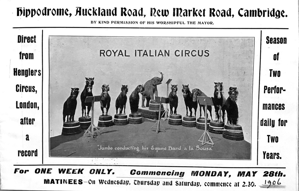 In 1906 and 1907 the Italian Circus returned to Auckland Road. The images below from the programmes, from Cambridge University Library Rare Books collection, give some idea of what it may have been like in 1899.