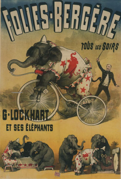 The premier turn is, of course, that by George Lockhart’s elephants, and too much cannot be said in praise of these gigantic performers. The instinct of the ponderous brutes is wonderful, and the manner in which each answers to its name elicits rounds of applause from the audience. Besides waltzing, playing various musical instruments (including bugles), walking with their hind and front legs, eating, drinking, and officiating variously as cook, waiter and policeman, “Boney” an elephant of a smaller growth than his companions, actually cycles, mounting, pedalling and steering his tricycle without any outside assistance.