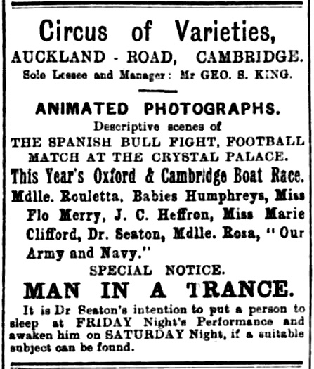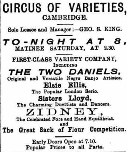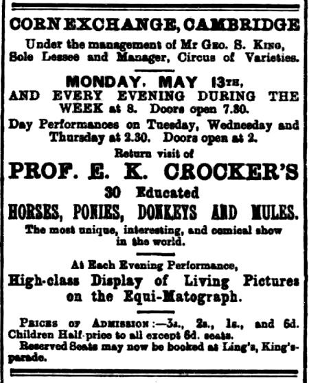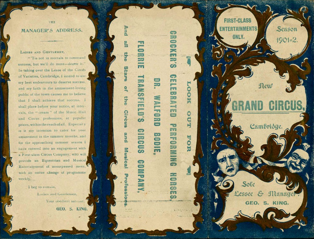 ‘’Tis not in mortals to command success, but we’ll do more—deserve it.’ In taking over the Lease of the Circus of Varieties, Cambridge, I intend to use my best endeavours to deserve success, and my faith in the amusement-loving public of the town causes me to believe that I shall achieve that success. I shall place before your notice, at intervals, the ‘cream’ of the Music Hall and Circus professions, at popular prices, within the reach of all. Especially is it my intention to cater for your amusement in the summer months, and for the approaching summer season I have entered into an engagement with a First-class Circus Company, who will provide an Equestrian and Musical Entertainment of unsurpassed merit, with an entire change of programme weekly.