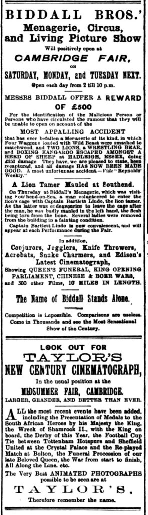 We find no press mention of the circus until late June. Midsummer Fair – ‘the usual flash of tinsel, glare of lights and blare of instruments of torture’ (CIP, 28 June 1901, p 5), began on June 24 and there must have been competition from the Biddalls’ Colossal Combination of Menagerie, Museum, Theatre of Varieties and Circus (CIP, 21 June 1901, p 5). Their gruesome and sensationalist advertising perhaps appealed to the ‘thousands nightly [who] have convinced themselves that they enjoyed these flashy sights and nerve-shocking sounds’ (CIP, 28 June 1901, p 5). Taylor’s Cinematograph was also at the Fair.