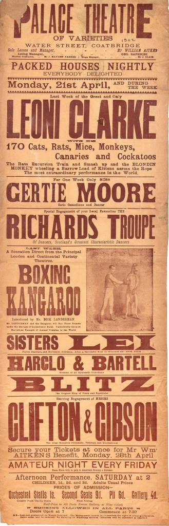 But two other animal acts on the opening programme of 8 April 1901 really impressed the audience – Leoni Clarke’s performing cats and the ‘distinctly novel’ boxing kangaroo: