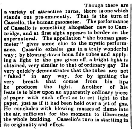 The next week’s new programme was full of activity. Full houses watched as in the ring a young Miss Marguerite rolled on her globe, The Rozzells swung on the horizontal bar, the acrobatic Four Grovinis tumbled, and Miss Pauline Sivado gave a graceful and pleasing bareback ride. In the air were Harry and Minnie on the flying rings and Alf Levarni, skilful on the high wire. But the act that made the biggest impact was Cassello the Human Gasometer. Cassello promoted himself as ‘The most Novel and Sensational Fire Act before the British Public. Thoroughly refined, and Guaranteed Safe’ (The Era, 29 December 1900, p 2), which was just as well if you read the CDN review (20 August 1901, page 2):