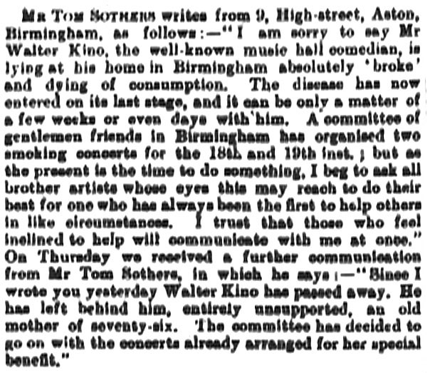 Top of the bill was comedian Walter Kino (Walter Davis) who had been heading variety programmes from the 1890s and was a great favourite with Cambridge audiences who found his ‘manner of singing a humorous song is refined and quite irresistible’ (CDN, 16 July 1901, p 2). Four months later this sad notice appeared in The Era (7 December 1901, page 20):