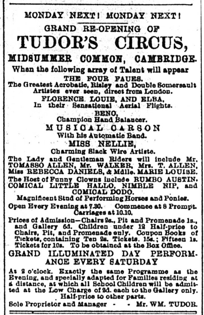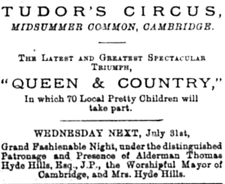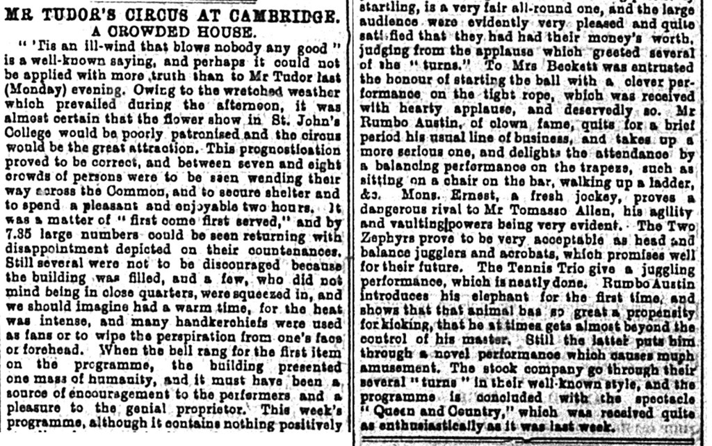 A week later the Cambridge Express was pleased that ‘a large building has been erected on Midsummer Common, in which the comfort of the audience has been well consulted’ and that it was ‘an entirely new and commodious building’ (CE, 22 June 1895, p 8). The Cambridge Daily News reported on a ‘specially erected building on Midsummer Common’ which was ‘of a substantial character, commodious and exceedingly comfortable’ (CDN, 18 June 1895, p 2), while the Cambridge Independent Press was grateful that the monotonous long vacation would be relieved by the return of Tudor’s Circus.