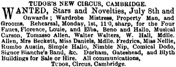 Tudor was advertising for acts in The Era (p 23) as late as 15 June: