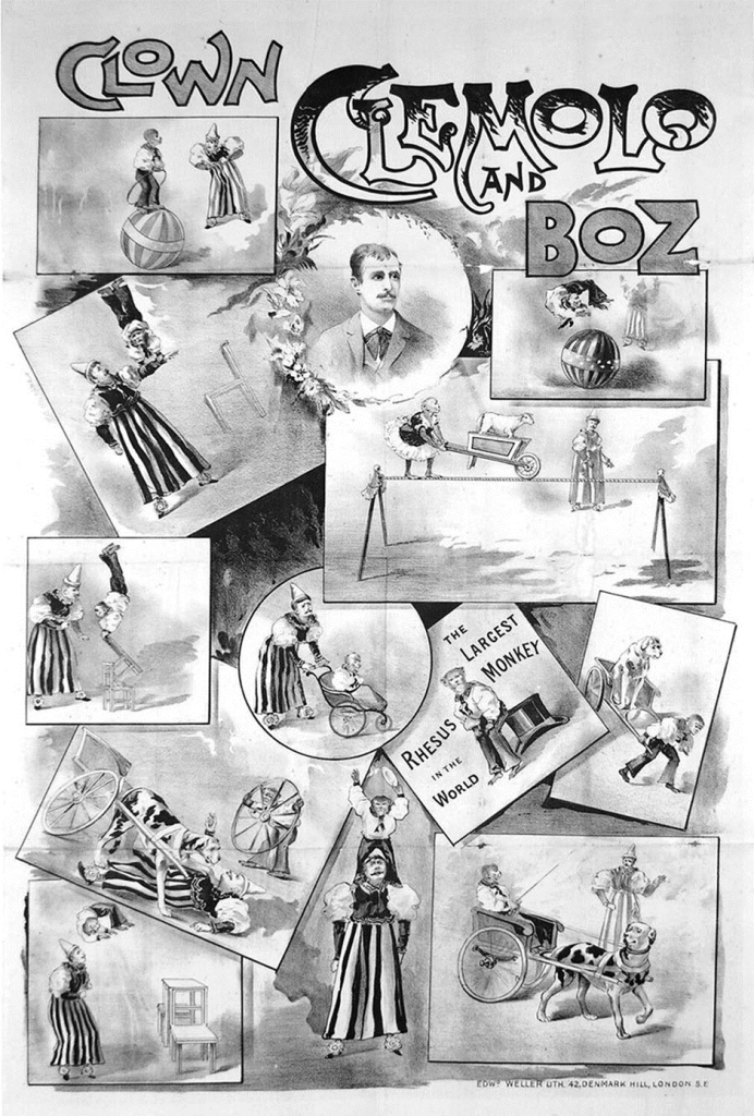 Clemolo, Little Jo, Clown Clemolo or Professor Clemolo had performed for many years as a trapeze artist with his brother, and also with an eccentric troupe of intelligent, performing dogs and monkeys. Tudor must have known the Clemolo brothers for a long time as he was on the same bill as them at Stoodley and Harmston’s Circus in Leicester in March 1876 (Leicester Chronicle, 11 March 1876, p 10). In December 1883 at Tayleure’s Circus, Clemolo, on going to feed his three dogs, found that they were dead. We do not know what happened, but he was able to recruit more, and dogs and monkeys were soon back in action in January 1884. His most famous monkey, Alley Slinker, the most marvellous monkey on earth, was a great favourite throughout the 1880s and 1890s. He could walk a tightrope and turn a double somersault on a rolling globe, a feat which was apparently the talk of London. The poster below appears to be Clemolo with a monkey called Boz, who is doing the same tricks, and since Slinker was performing in March 1895, it was likely to be him in Cambridge: ‘Clemolo’s champion performing monkeys are the most attractive and interesting feature and cause any amount of laughter’ (CIP, 12 July 1895, p 8).