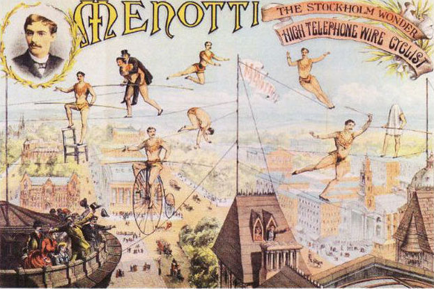 The programme on 23 August advertised ‘Mr W. Kingsley, the only Royal handbell soloist who had performed by special command before Her Majesty the Queen at Osborne House,’ but in the event he was unable to appear. One hopes that the daring tumbling of Jackley and Fratelli and the high-wire cyclist from Stockholm, Menotti, made up for the loss. Menotti succeeded. No-one from the audience volunteered to be carried across the highwire so Nimble Nip the clown was substituted. Menotti concluded by riding a bicycle backwards and forwards on the wire to deafening applause. The CDN wondered if Cambridge had ever seen his equal (27 August 1895, p 2).