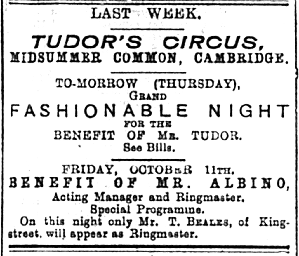 There were benefit nights and competitions with the proceeds on Tuesday 15 October donated to Addenbrooke’s Hospital, and benefits for the popular clown Nimble Nip on 7 October, for Mr Tudor at A Grand Fashionable Night with horse races in the ring on 10 October, and on the next night for Mr Albino, while Mr T. Beales of King Street acted as ringmaster. The faithful CDN reviewer reported the winners of the various races, horse racing, a trotting race, a running race, a duck hunt, musical chairs, a guess-the-money-in-the-bottle competition and a conundrum competition: ‘Why is Nimble Nip the clown like glass? Because he is a tumbler’ (CDN,12 October 1895, p 3).