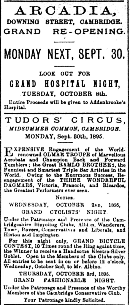 As we have seen, Tudor had managed to extend the circus season beyond the end of the month and on 1 October the CDN was reporting on a variety of acrobatic acts including the Paulos on their colossal ladder. The Grand Cyclists’ Night was eagerly anticipated on the Wednesday with a race ten times round the ring between the various Cambridge Cycle Clubs. The following week there was to be a Buffalo night under the auspices of the Cambridge Royal Antediluvian Order of Buffaloes. The CDN was now reviewing Arcadia as well as the circus so even more entertainment for the reporter! The CEX reported that ‘Notwithstanding that the Arcadia has been open during the week the circus has received a good share of patronage’ (CEX, 5 October 1895, p 8).