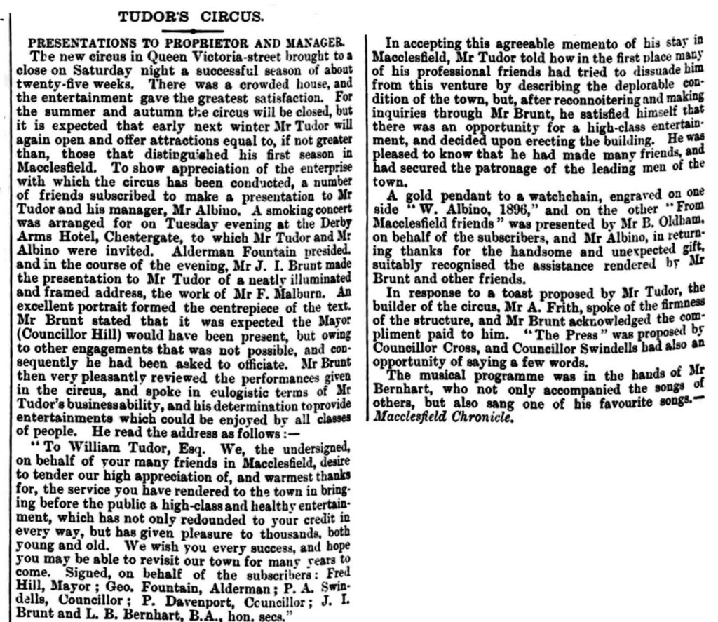 As we know, William was not a man to let the grass grow under his horses’ hooves, so Turpin-like he dashed north to Yorkshire and opened a season in the Grand Circus Hall in Doncaster on 21 October, running until 16 January 1896. Overlapping with that was a six-month season in a new building in Macclesfield, 25 November until 23 May 1896. Tudor and his Macclesfield circus had been so popular that a special concert was arranged at which he was awarded an illuminated and framed address, while Mr Albino was presented with a gold watch.