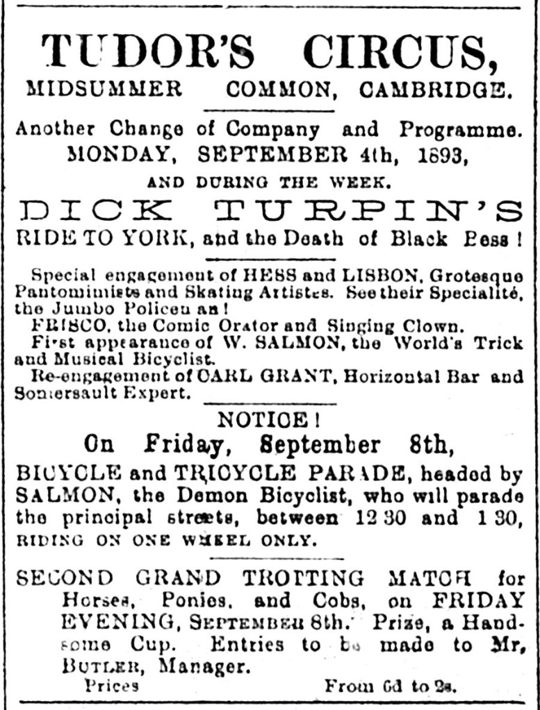 Two years later in 1895 the Cambridge Daily News gave an even more detailed review. ‘The grand equestrian Spectacle’ is repeated and ‘much appreciated by the Cambridge public, and the circus was filled in every part.’