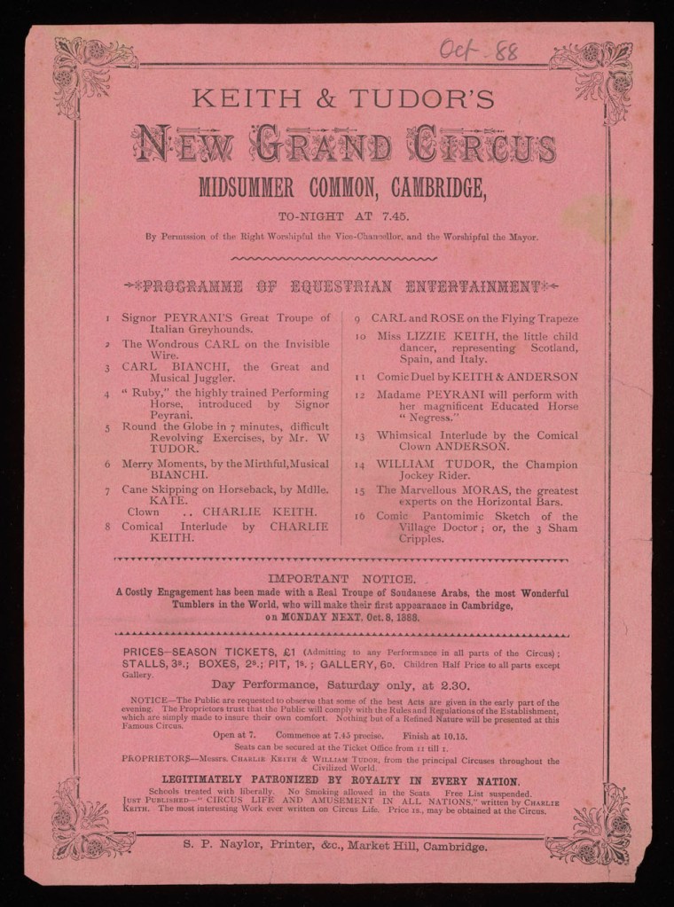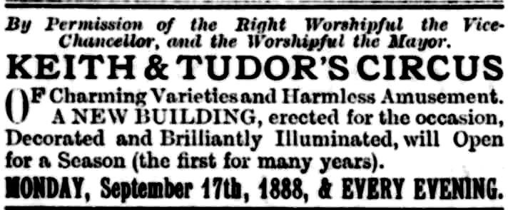 By 1888, Charlie Keith (‘the Roving English Clown’), born 1836, was a well-established circus manager, clown, and designer of temporary circuses. William Tudor, 17 years his junior, had about 20 years of performing behind him, as well as some management experience. The two men had worked together in 1882 when Tudor toured with Charlie Keith’s portable circus. On 8 September 1888 this advertisement appeared in the Cambridge Daily News.