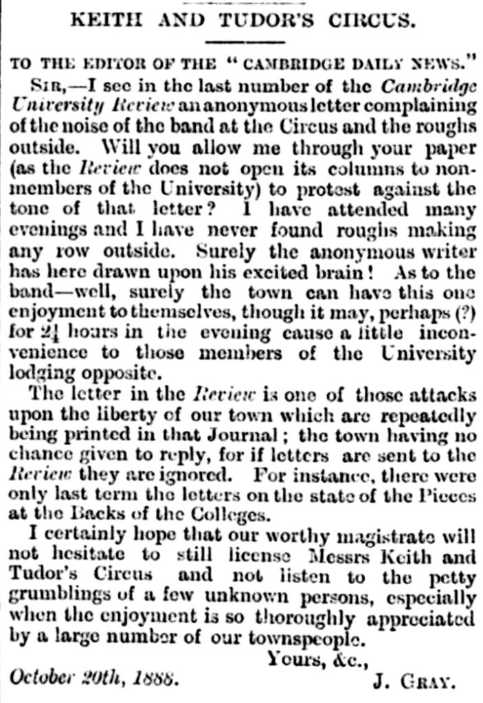 However, Mr J Gray is once again published in the Cambridge Daily News on 3 November, defending the circus from complaints in the Cambridge Review. It seems to be a classic town-and-gown culture clash, as these excerpts show: