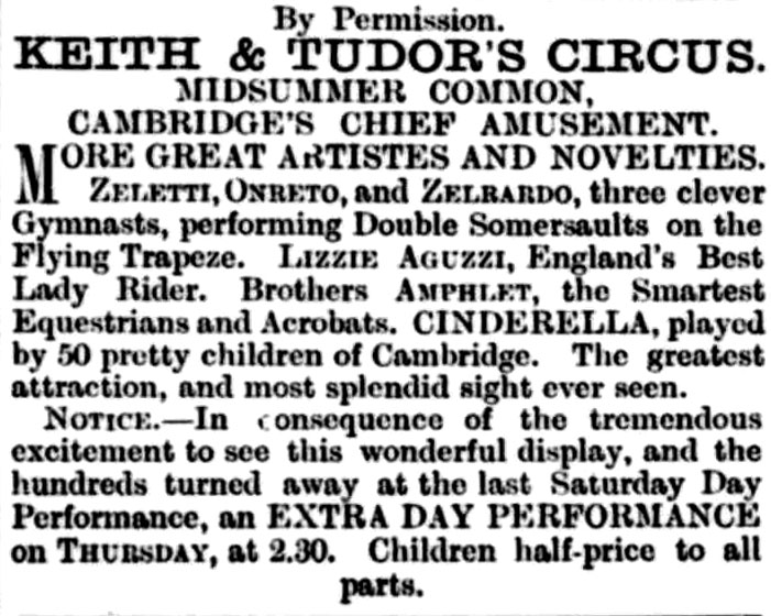 Popular as circuses usually are in Cambridge, there seems to be every probability that that of Messrs. Keith and Tudor, which now finds a locale on Midsummer Common, will surpass its predecessors in general esteem, and that this will be the case there can be little doubt, if throughout the season . . . such excellent programmes are arranged as the one which has this week been presented to the public.