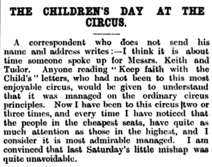 But ‘Keep faith with the Child’, still friendly but not fully satisfied, wrote again on 31 October that he thought Keith and Tudor should manage things better if they ‘desire to make the performances at their circus as popular as they deserve to be’. On 1 November, there was unequivocal support for Keith and Tudor: