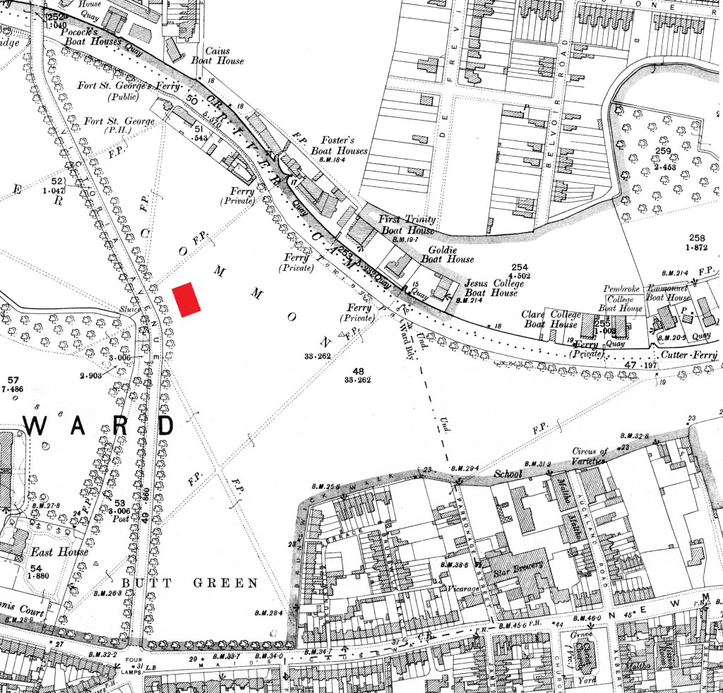 Butt Green and Midsummer Common, surveyed in 1901, with Charlie Keith’s temporary 1892 building shown in red next to the bend in Victoria Avenue. Tudor’s 1893 building was ‘near the corner of Jesus Grove,’ which we take to refer to the same position and we assume the same location in 1895. There is evidence that the buildings of 1888 (Keith & Tudor), 1890 and 1891 (Keith), were much further south and possibly west of the line of Victoria Avenue, which opened in 1890. Tudor’s permanent building of 1896, here in its second guise as the Circus of Varieties, is shown next to the common at the north end of Auckland Road.