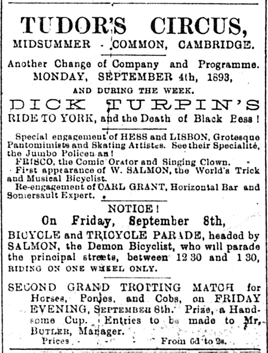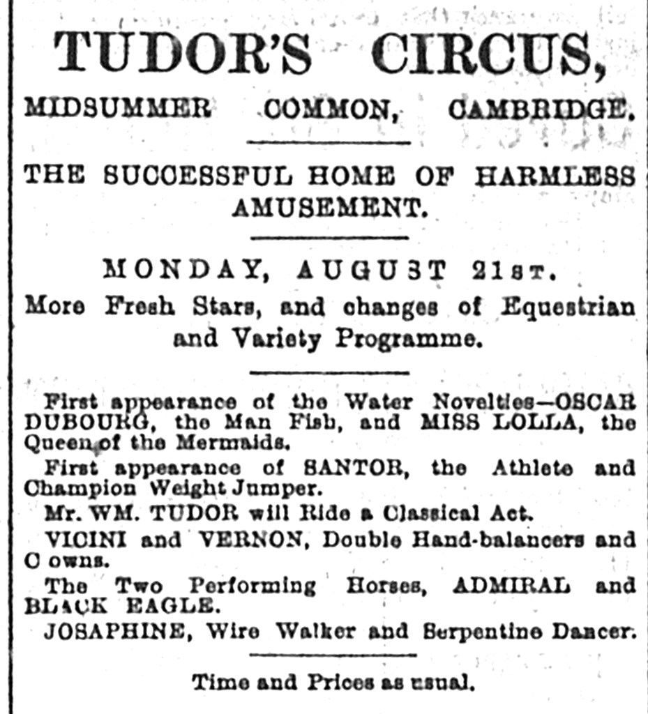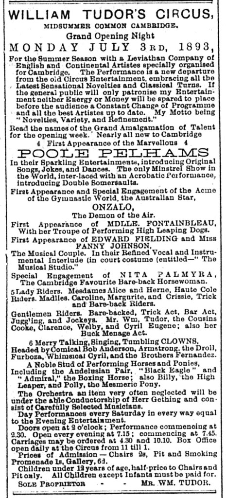 The audience came, the first reviews were enthusiastic, describing the wooden building as ‘commodious and comfortable’, the circus well managed, and reporting that ‘all went merrily from first to last’ (CDN, 4 July 1893, p 2), with dancers, vocalists, acrobats, performing dogs and horizontal bar performers all praised. There were three separate equestrian acts – Mdlle Caroline, Mdlle Fontainbleau and Mdlle Nita Palmyra – as well as Mr Tudor’s two performing horses, Admiral the boxing horse and Black Eagle. For the Cambridge Express, Mr Tudor was ‘an old friend of the Cambridge public’ and had ‘brought with him enough of old favourites of the ring, and a sufficient number of new ones, to make the success of his performances pretty well assured’ (CE, 8 July 1893, p 8).