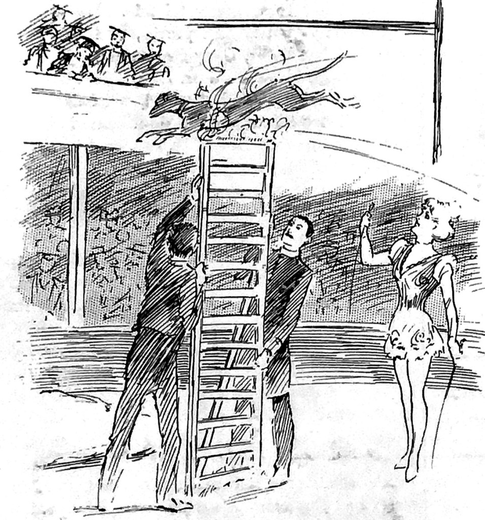 As one would expect, the staple circus acts of acrobats, jugglers and trapeze or wire artists were always on the programme. An expensive engagement, according to the Circus advertisements, was of the sensational acrobats, La Troupe Fretelli, direct from Paris, who turned double and single somersaults from head to head. On the same bill was Wallacini, or Ben Hadsi, who appeared twice nightly, once as Wallacini, leaping backwards from a pyramid of tables, and then as the Arab Whirlwind somersaulting backwards around the ring four times with amazing rapidity (CDN, 11 July 1893, p 2). The audience must have left with their heads whirling after all the tumbling, somersaulting and reverse flips.