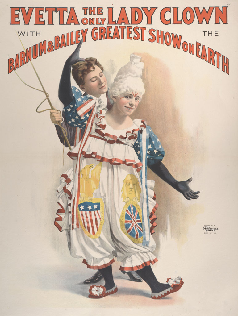 She was Josephine Mathews, or Josephine Williams, known as Evetta, the Lady Clown, who went on to be quite a sensation in the USA with Barnum and Bailey. On the same bill in Cambridge were ‘the two Sisters MATHEWS, Comical Knock-about Song and Dance Artistes’ (CDN, 14 August 1893, p 2), who were almost certainly Josephine’s sisters, or possibly Josephine and one sister, as she came from a prodigious circus family. Our CDN reviewer thought that these ‘knockabout song and dance artistes, created a good impression by their singing and dancing, the latter being particularly good’ (CDN, 15 August 1893, p 3). A week later Josephine had become ‘quite a favourite’ with the Cambridge crowd as she gave ‘a very pleasing performance on the telegraph wire, but eclipsed herself in her next entrée by a cleverly-executed serpentine dance’ which ‘fairly brought down the house’ so much so that she ‘had to bow her acknowledgments several times’ (CDN 22 August 1893, p 2). For more information on this unique young woman see Evetta the Lady Clown.