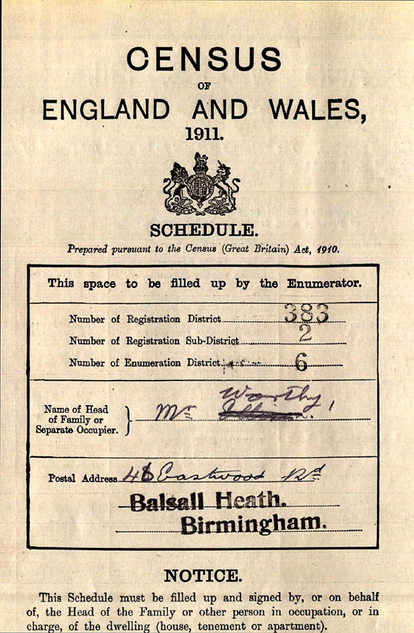 William Worthy and Emily Birch were married in her home town of Bishops Stortford in the summer of 1903 and in the 1911 census they are to be found in Birmingham with daughters Viola, aged 5 and Patricia, 10 months, and William’s 14-year-old niece Dorothy Willers. The census taker initially entered William’s nom de plume on the return, as can be seen here:
